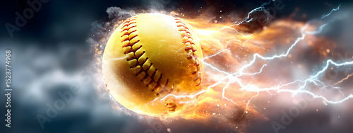 © sornram, Fototapeta premium A dynamic image of a flying softball with energy bursts and lightning effects, capturing the thrill of the game.