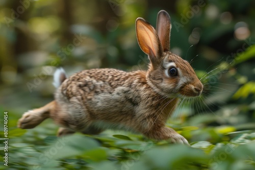 Fototapeta premium A dynamic image of a wild rabbit in motion as it runs through lush green foliage in a natural setting