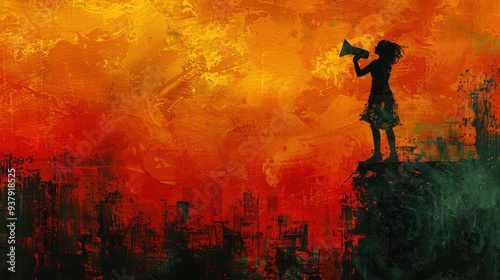 Fototapeta premium A dynamic image of a woman standing on a high ledge, megaphone in hand, her voice projecting loudly as she inspires the crowd below her to take action, woman empowerment concept, abstract