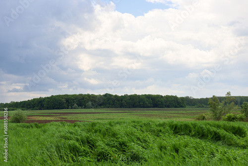 © Олег Струс, Fototapeta premium ​A dynamic landscape where the wind sways the green grass in the foreground, creating a sense of movement.