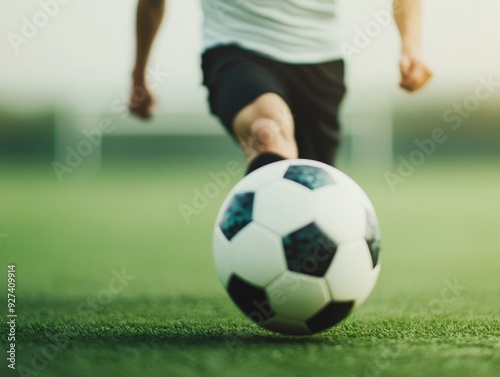 Fototapeta premium A dynamic moment capturing a soccer player dribbling a ball on a lush green...