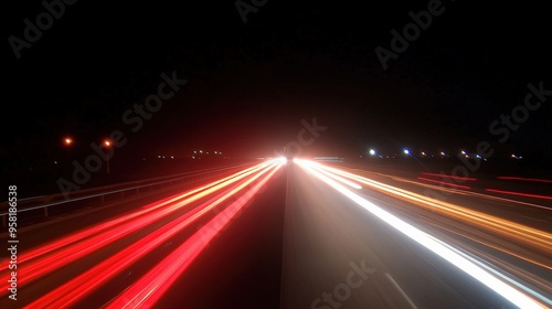 Obraz premium A dynamic night scene showcasing light trails from vehicles on a highway,...