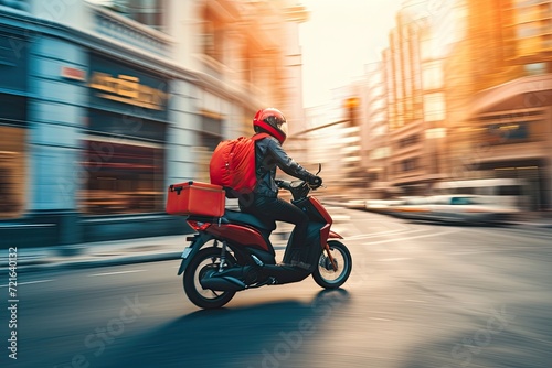 Fototapeta premium A dynamic scene of a food delivery moto scooter driver, with a bright red backpack, navigating through a bustling city street.