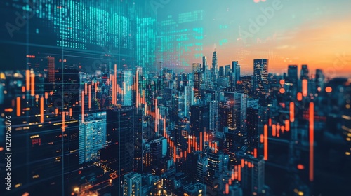 © pingpao, Fototapeta premium A dynamic skyline illuminated by digital graphs and data, capturing the energy of financial markets and urban development at sunset.