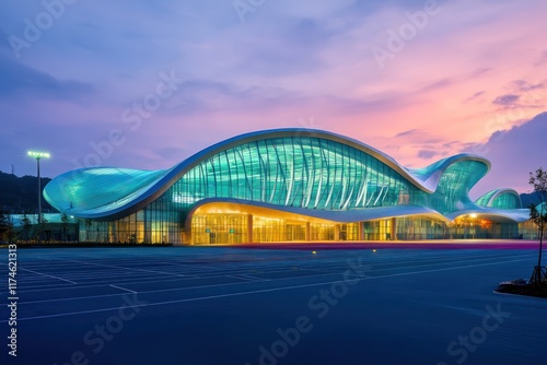 Naklejka premium A dynamic sports complex with fluid shapes, translucent roofing, and vibrant lighting designed for energy efficiency