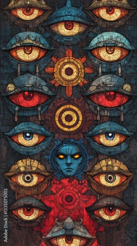 © Julia, Naklejka premium A dynamic stained glass eye design showcasing bright colors, complex patterns, and a fascinating central iris, resulting in a captivating visual experience