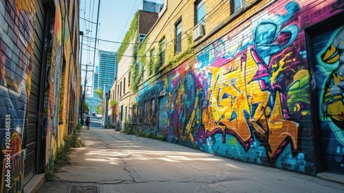Naklejka premium A dynamic street art mural in an urban alley, showcasing vibrant graffiti and...