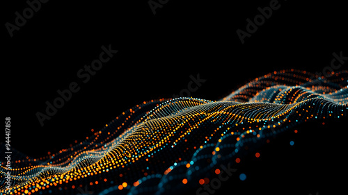 Obraz premium A dynamic wave of data points flowing through a dark digital landscape