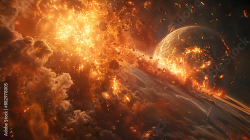 Fototapeta premium A dystopian solar planet experiencing the effects of a massive coronal mass ejection, with fiery explosions and atmospheric disturbances