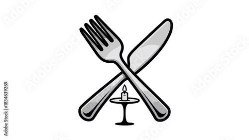 Fototapeta premium A elegant black and white image showing a knife and a fork crossed over a table with a candle.