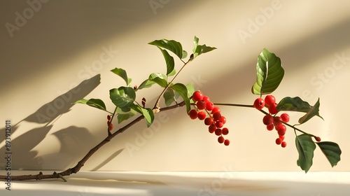 © Neuropixel, Fototapeta premium A elegantly arranged branch featuring vibrant red berries and lush green leaves, casting soft shadows against a neutral background.