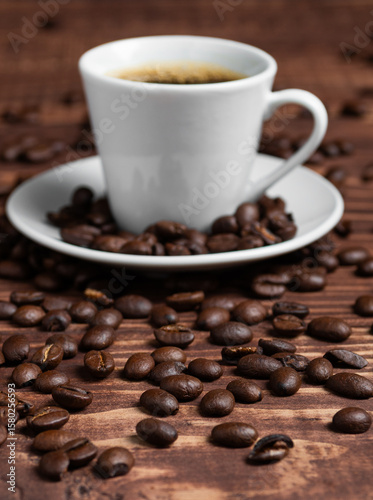 Fototapeta premium A espresso cup with dark coffee sits on a saucer, surrounded by roasted beans on a wooden surface.