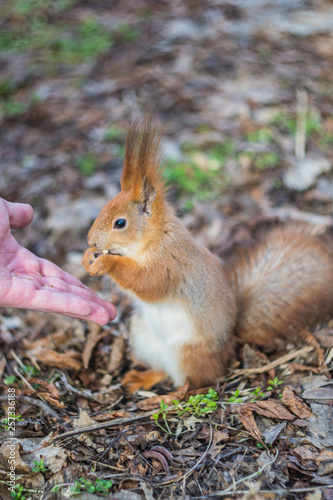 Obraz premium A European squirrel eating nuts from a stretched-out hand, in a park on a sunny spring day.