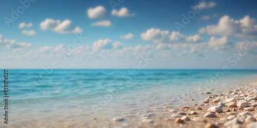 © DEER FLUFFY, Fototapeta premium A expansive body of water rests upon a sandy shore under a blue sky, dotted with a few white clouds.