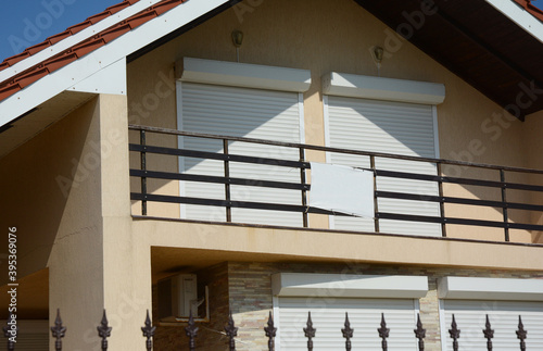 © bildlove, Obraz premium A exterior view of large attic, loft windows closed with pvc motorized window roller shutters leading to the open balcony of a house.
