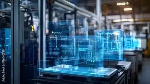 © jiraphat, Naklejka premium A factory floor with a blue screen showing a building. The building is made of cubes and is surrounded by other cubes. The blue screen is glowing and he is a projection of the building