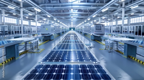 Fototapeta premium A factory with a large number of solar panels. Scene is industrial and...