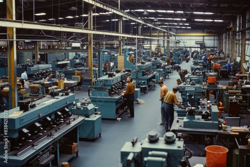 Naklejka premium a factory with workers working on machines, a factory with workers working on machines, Factory floor with workers operating machinery