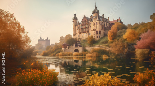 © vichudapan, Obraz premium a fairy tale castle perched on a hill, surrounded by pastel-colored gardens and a shimmering lake