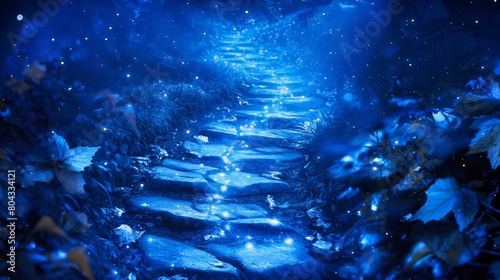 Naklejka premium A fairytale-like stone pathway illuminated by magical blue lights in a...