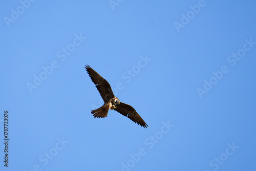 Obraz premium A Falco eleonorae of prey soaring in a clear blue sky.