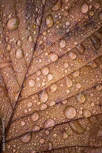© AlMacro, Fototapeta premium a fallen leaf with raindrops. a close-up of a leaf. a colorful photo of nature in the rain. an illustration.