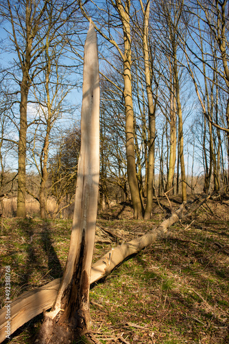 Fototapeta premium A fallen tree in a forest in the sunlight after a storm