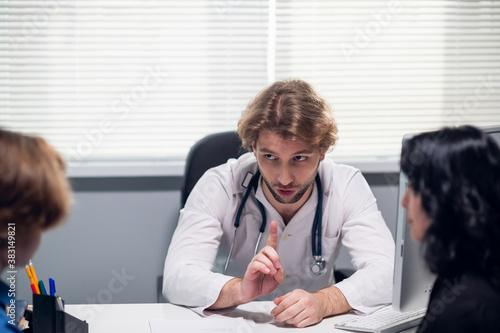 © Anna Kosolapova, Obraz premium A family doctor conducting a medical checkup, asking questions, making notes.