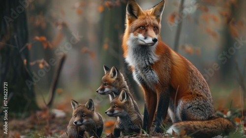 © Cherkasova Alie, Obraz premium A family of chanterelles in the forest. A female fox and small foxes.