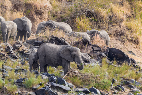 © Victor, Fototapeta premium A family of elephants on the banks of the Mara River. Masai Mara, Kenya. Africa