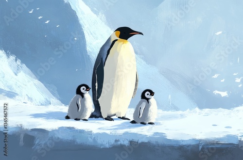 © b, Fototapeta premium A family of emperor penguins standing in the snow