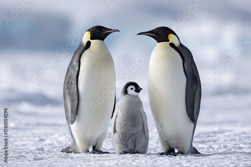 © adnan, Fototapeta premium A family of Emperor penguins stands on a snow-covered surface