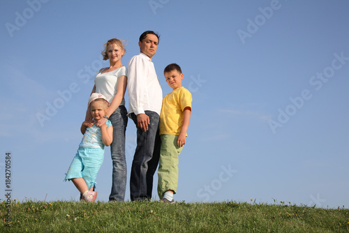 © Pavel Losevsky, Fototapeta premium A family of four is standing on a grassy hill, with the father and mother standing between the two children
