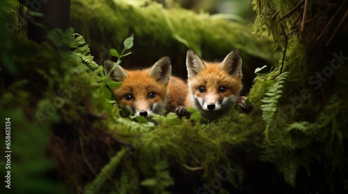 © Aqib, Fototapeta premium A family of red foxes playing a game of hide and seek among the ferns