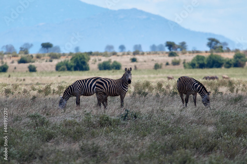 © monchak, Fototapeta premium a family of zebras walking. safari kenya