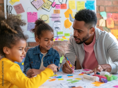 Fototapeta premium A family reviewing their budget plan for the year ahead, with sticky notes and markers on a whiteboard filled with financial goals
