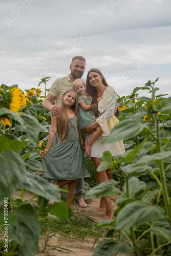 Fototapeta premium A family with two daughters in a sunflower field, looking at the camera....