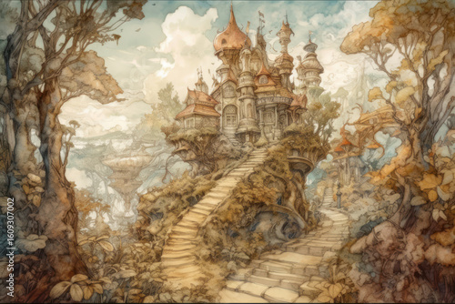 Naklejka premium A fantastic castle on top of a hill, surrounded by a fairytale forest. A spiral staircase leads to a majestic building with carved turrets and graceful architecture.