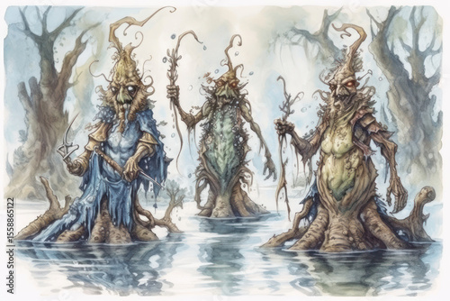 © Evdoha, Fototapeta premium A fantastical watercolor illustration of three mystical creatures reminiscent of swamp shamans or ancient tree spirits.