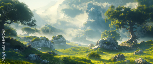 Fototapeta premium A fantasy landscape with an array of flowers, lush greenery and towering rock formations. The sky is filled with soft clouds. surrounded by shrubs and trees, creating a serene atmosphere.