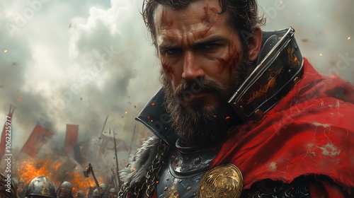Naklejka premium A fantasy male warrior stands confidently on a battlefield, wearing majestic...