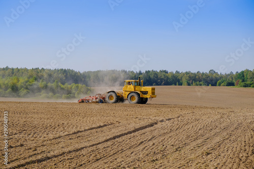 © Александр Овсянников, Obraz premium A farm tractor cultivates land after harvesting grain.