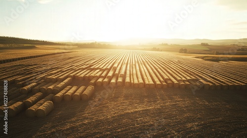 Naklejka premium a farm with a large pile of freshly pressed straw bales. The bales are arranged in neat rows under the bright sunlight,