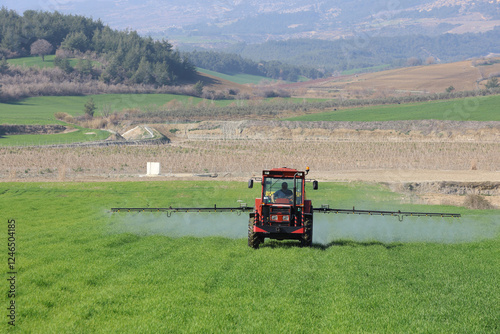 Fototapeta premium a farmer applying fungicide to protect the wheat crop from bunt disease