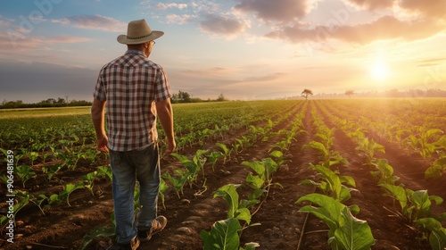 Fototapeta premium A farmer in a plaid shirt and hat walks through rows of crops as the sun sets in the distance