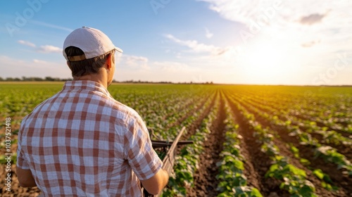 Fototapeta premium A farmer in plaid shirt and cap is tending to a lush green field under a...