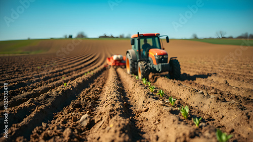 Fototapeta premium A farmer plowing a field with a tractor, cutting deep furrows into the rich, brown soil. The vast landscape shows the first signs of spring, with green sprouts emerging and a bright blue sky above
