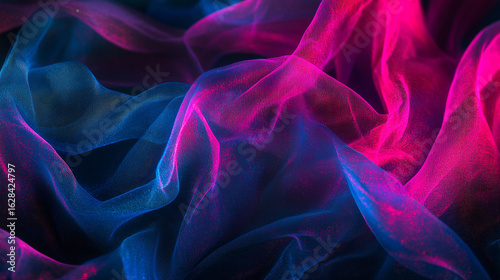 © Евгений Архипов, Obraz premium A fashion editorial backdrop of flowing neon glitter fabrics glowing in electric blue, pink, and lime, dynamic folds under blacklight