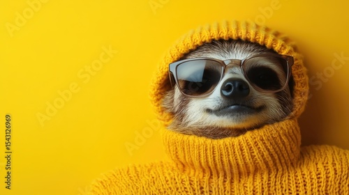 Fototapeta premium A fashionable sloth wears stylish sunglasses and a cozy knitted sweater against a vibrant yellow backdrop, exuding a playful and trendy charm that captures attention effortlessly.