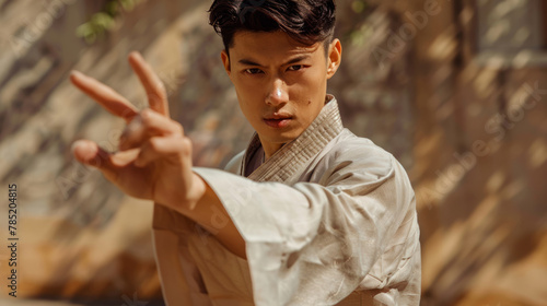 Fototapeta premium A fashionably dressed man, practicing kung fu, one hand stretched forward,...